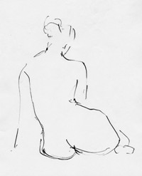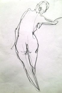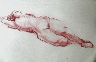 10分のポーズではコンテを多用しますが、それでも5分ぐらいで充分です。描き込みすぎるのは本来のクロッキーではないという思いがあります(ヒト様々ですが)。5分以上掛けると、もはやデッサンの領域だと、クロッキーの留めどころがない、と言ってデッサンまでの描き込みがない、私はこのあたりのあいまいなところを「スケッチ」と呼んでますが。近頃は、ポーズ時間が長いようで・・・、以前は盗むように数を稼いだ記憶があるのですが、移動してでも数をこなした、今は、イーゼル立てて描くヒトもいるほどですから・・・「カルチャーセンター」の功罪でしょうか。ひところは、間が持たなくて、水彩絵の具で着彩してましたが、やはり、クロッキーはモノトーンが判りやすいですよね。